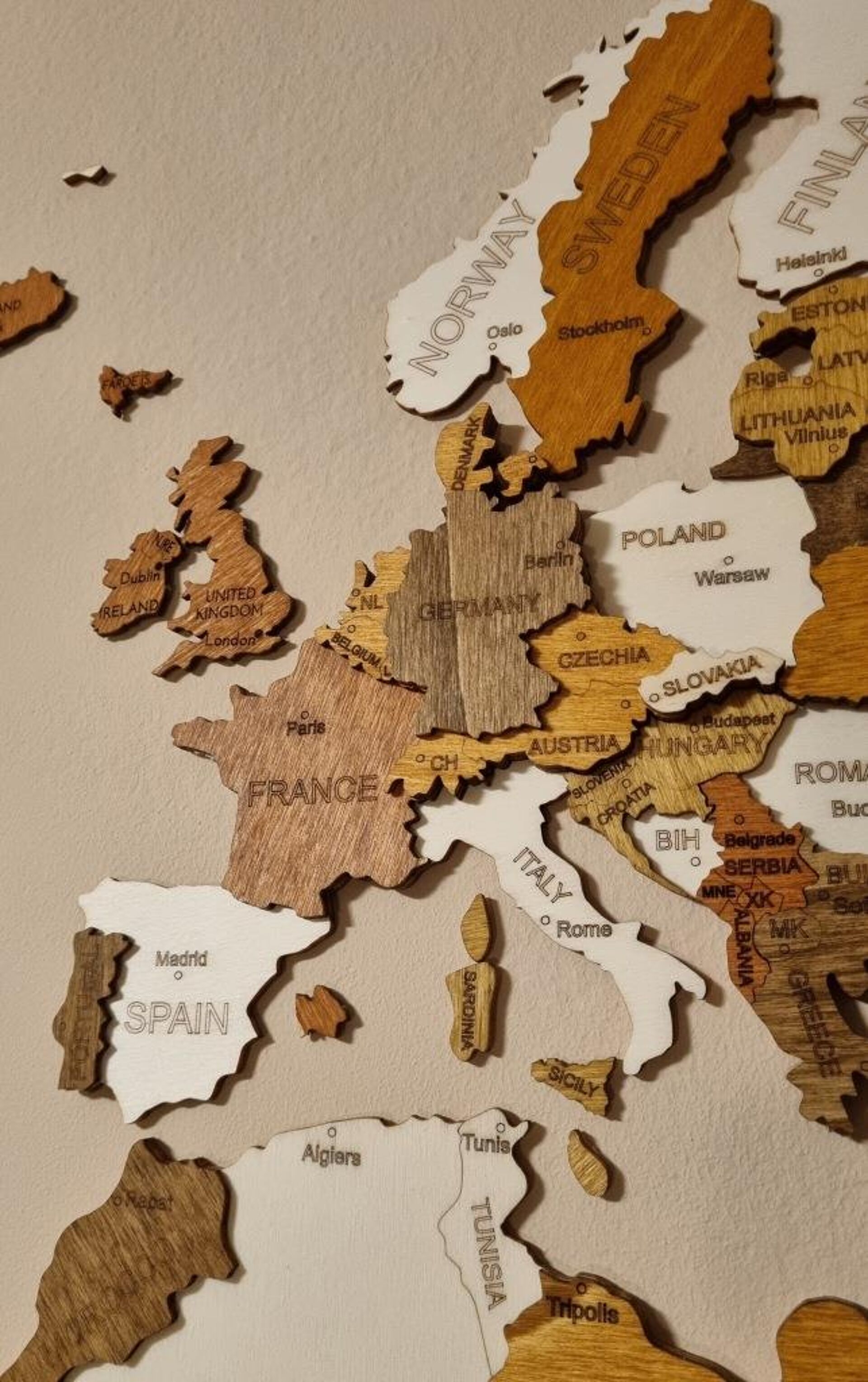 Todas las versiones de los mapas están realizadas con tableros de madera cortados con láser de precisión y pegados a mano, con una calidad excepcional. Las fronteras, los nombres y las capitales de los países están perfectamente grabados (si el espacio lo permite). Los continentes encajan a la perfección y ofrecen un aspecto impresionante. Los países están tintados de cinco diferentes colores con barnices naturales para madera (más una capa natural).