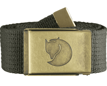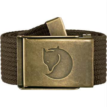 Robusto cinturón de lona. Longitud ajustable y hebilla militar con acabado de latón cepillado.