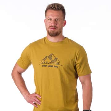 La camiseta de verano para hombre de corte clásico es una elección adecuada para diversas actividades de ocio, ya sea en la ciudad o en la montaña. La camiseta está decorada con un original estampado con motivos de paisajes boscosos. El ligero punto de algodón está tratado con un preperforado de silicona-enzima, que permite que el material conserve su forma y resulte cómodo al tacto. Con mangas cortas y escote redondo, la camiseta es adecuada para todo tipo de cuerpos. Una costura de recubrimiento en el escote y las costuras planas de los hombros sirven de protección contra los roces desagradables cuando se lleva mochila.
